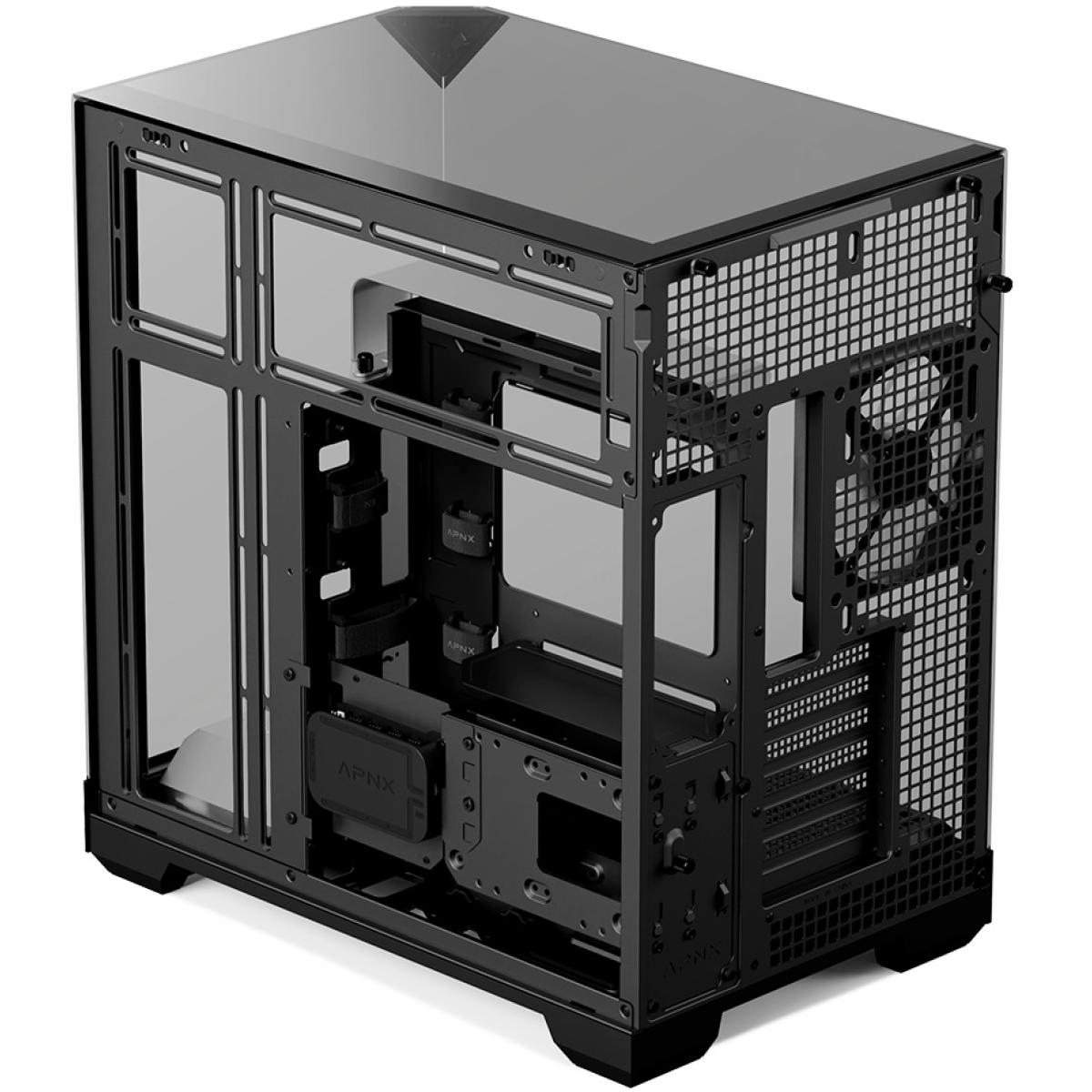 APNX V2 (Black) Dual Chamber Premium Sleek Panoramic 3 Glasses Design ATX Mid Tower Tempered Glass Gaming Case w/ Single Rear Fan, Support Up To 10x12cm Fans, Reverse Connector Motherboard & Type-C