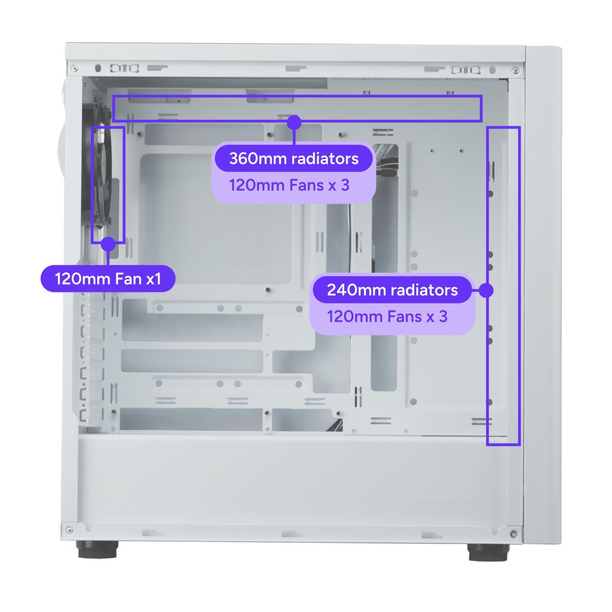 (Filtered) 140 mm x 3 / 120 mm x 3 Fan Support - Top (Filtered) 140 mm x 2 / 120 mm x 3 Fan Support - Rear 1x 120mm Pre-installed Fans - Front 3x 120mm ARGB Fans Pre-installed Fans - Top N/A Pre-installed Fans - Rear N/A Radiator Support - Front 120 / 140 / 240 / 280 / 360 / 420 mm (Limit: 457*140*27 mm) Radiator Support - Top 120 / 140 / 240 / 280 / 360mm Radiator Support - Rear 120mm |