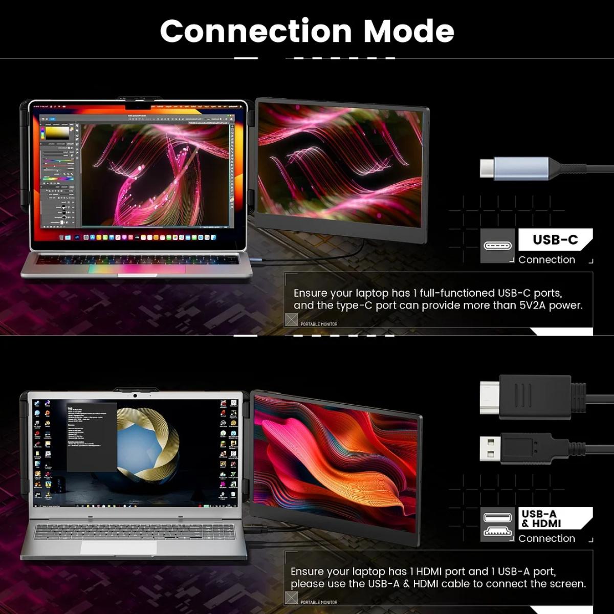 effectively reducing blue light radiation damage and ensuring comfortable viewing over extended periods. - Plug & Play Without Driver:Portable dual monitor offers a hassle-free experience with its plug & play functionality. Included in the package are all the necessary cables, including 1 Type-C cable, 1 USB-A cable,