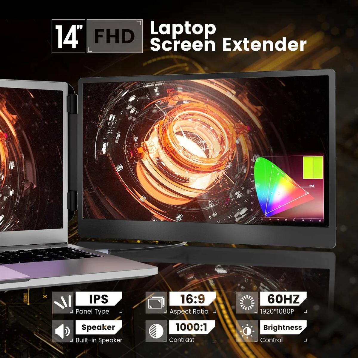 S1 Portable Laptop Screen Extender, 14" FHD 60Hz IPS Wide Viewing Angle , USB-C & HDMI , 72% NTSC, 300 cd/m², Plug & Play, 180° Rotation Angle w/ Speakers & Bag For Mac/Windows