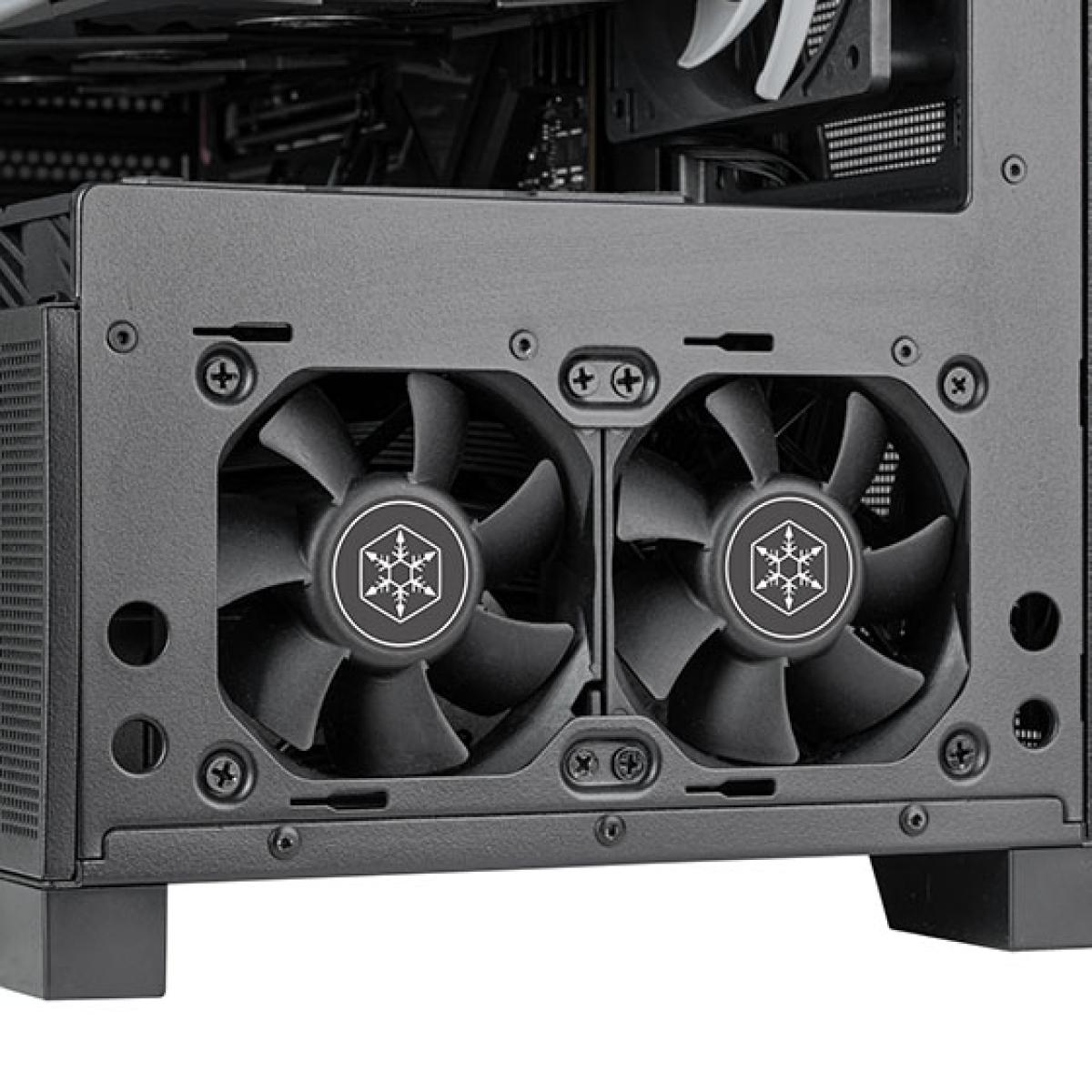 Cooling system Rear 120mm x 1 (120mm x 1 ARGB fan included) Top 120mm x 3 / 140mm x 2 Internal Motherboard Tray:120mm x 2(120mm x 2 ARGB fans included) PSU Shroud:Top:120mm x 3 Front:80mm x 2 Radiator support Rear 120mm Top 120mm / 140mm / 240mm / 280mm / 360mm[2] Internal Motherboard Tray:240mm[3] |